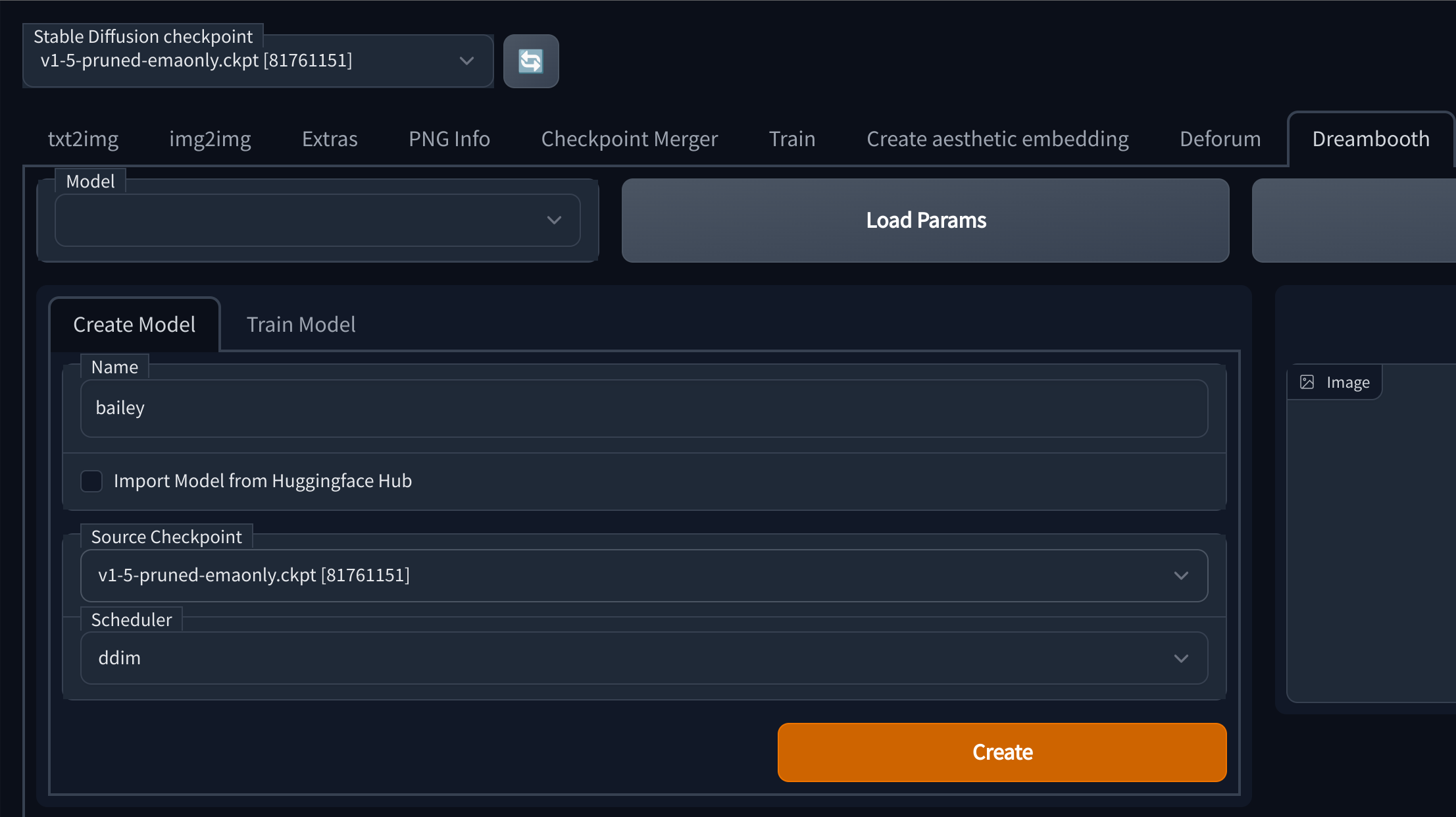 - On create model, enter a name for your model, select a source checkpoint and click create
